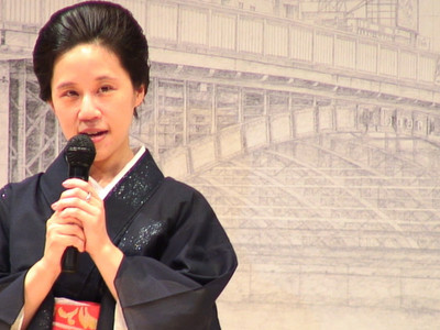 実はこの日、準備に追われて3日間で2時間くらいしか眠っておらず、徹夜のまま朝6時半に急いで着物を着て7時に美容院へ行き、その後チャーターした車で着物一式を会場に搬入した後、会場準備、結髪、着装、リハーサルに入り、本番へとなだれ込み。何と、朝から一度も化粧直しをする間もなく本番を迎えたので、口紅や眉などはがれ落ちてしまっています。とほほ。