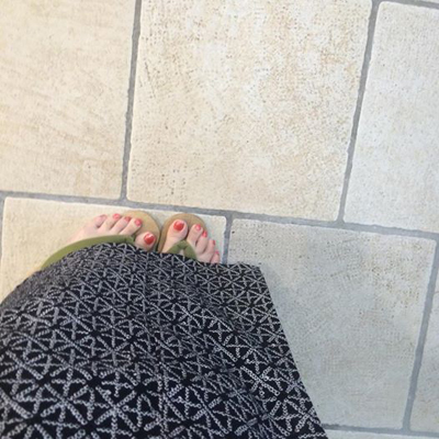 日本の色の名前は人によってかなり感じ方が違うことが多く、決めるのは難しいなと感じますが、この鼻緒の色は「柳色」が一番近いでしょうか?やや鼠がかかった鶸色の鼻緒のついた、右近下駄です。そして、お茶を学んでいると、手の爪は派手な色には出来ないので、足だけは現代風に、華やかなマニキュアを縫っています。お稽古の時は足袋を履くので、見えませんから!