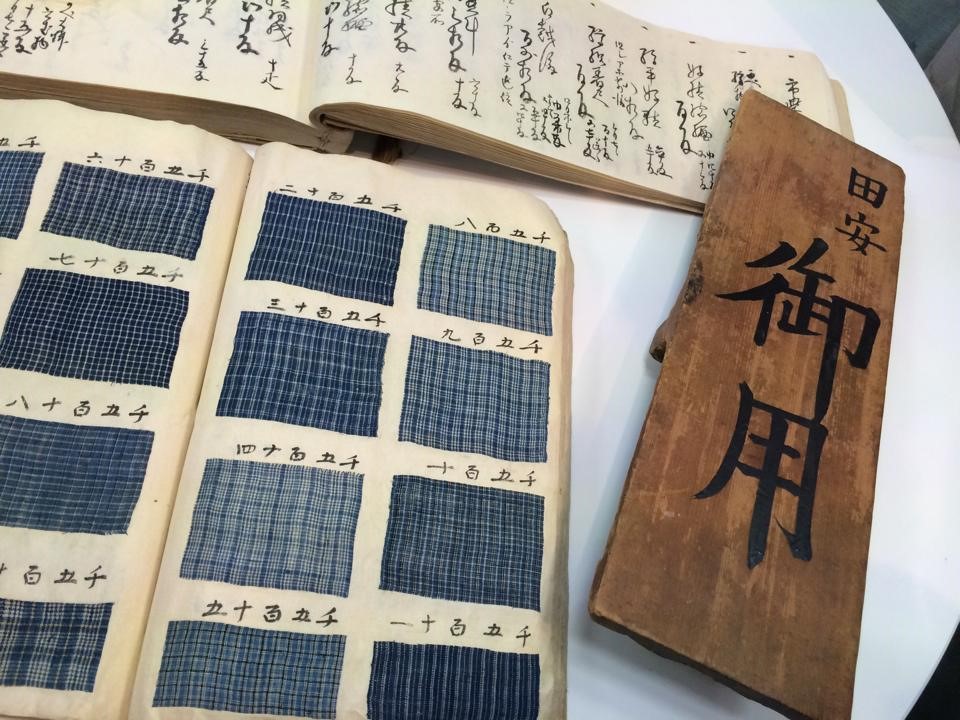看板の横にあるのは、西脇商店の縞帳。これも大変貴重なもので、何時間も見ていたい思いでした。