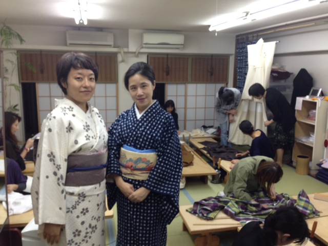 さて、先生とのお写真で、背景にたくさんの方がちくちくと縫ったり、仕立ての具合をチェックしたりしている様子が写り込んでいますが、こちらの和裁所は、プロの和裁士としてお仕事をされている方と、生徒さんとして和裁を習っていらっしゃる方が同じ場に混在し、非常に和気藹々とした雰囲気が大きな特徴です。