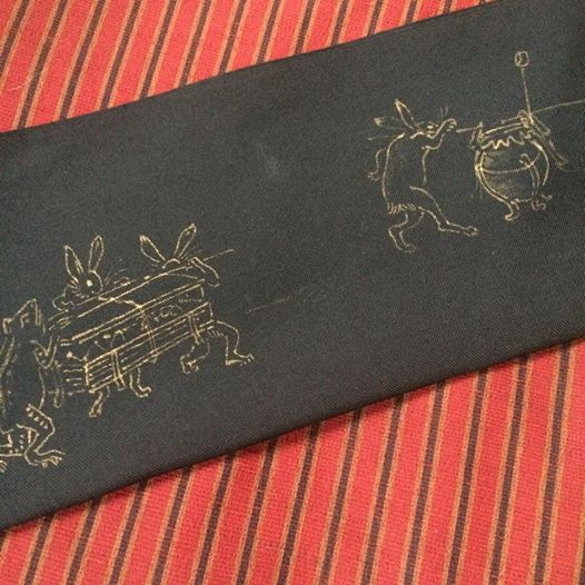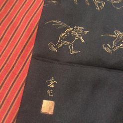 この帯には、現在京都国立博物館で全巻が展示されている「鳥獣戯画」の幾つかの場面が描かれています。友人のおばあさまの遺品を頂いたもののため、誰の作なのかは分からないのですが、落款もありました。この落款から作家名分かる方がいらしたら、教えてください!↓