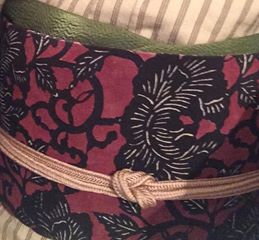 この単衣で、友人たちとお気に入りのビストロへ食事に行ったのですが、お店の照明が適度に落とし気味のため、ただの黒い帯を締めているように見えるかも知れません(まるで江戸時代の女性みたいw)。そこで、模様が見えるように床置きをして撮影してみました(きものの色は、一枚目の方が正しいです)↓