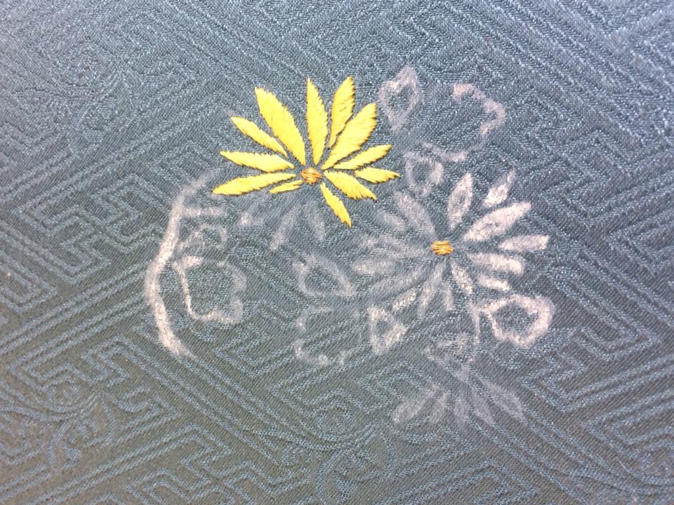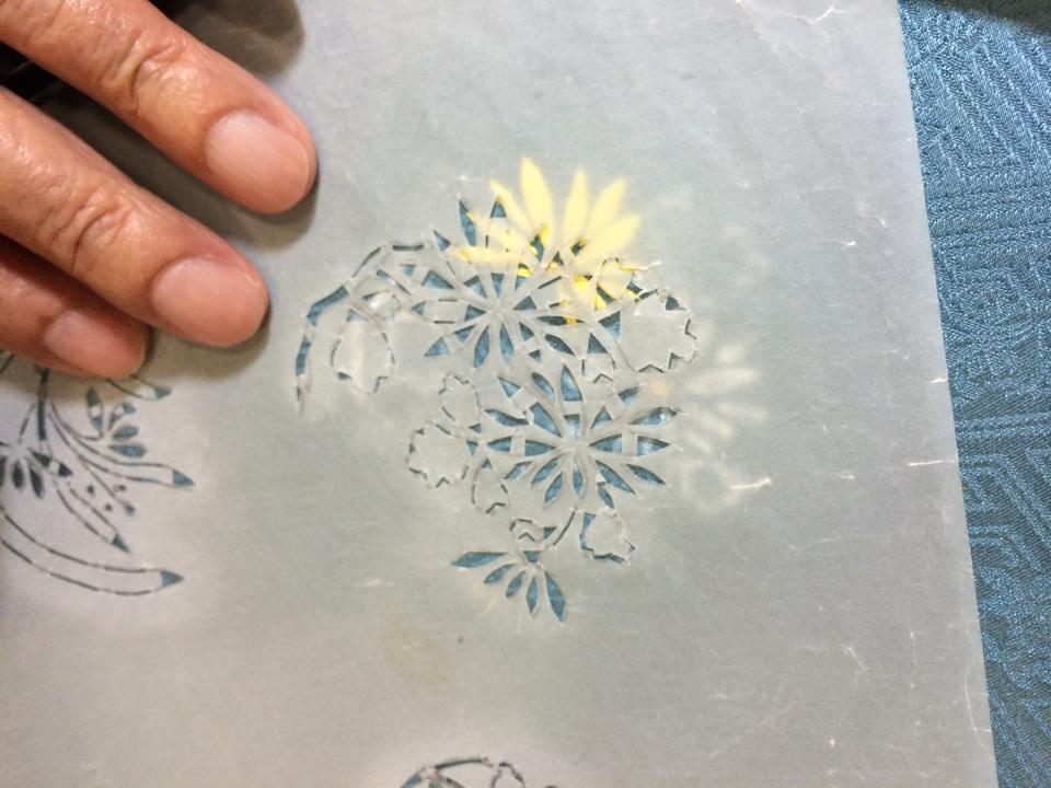 一枚目の写真は、刺繍をするための柄を切り抜いた薄紙。ここに、胡粉を掛けて布に付着させ、その上から刺繍して行くそうです。