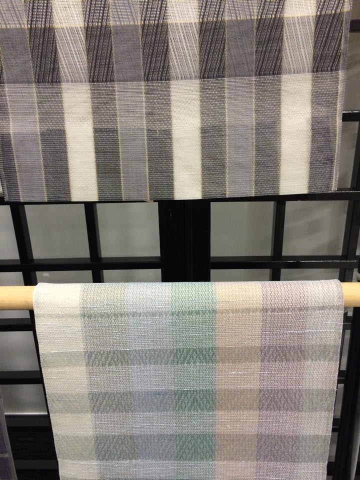 ↑お隣りの丹後から出店の「小林染工房」のブースでは、珍しい、柿渋で染めた糸(写真に写っている茶色の糸玉がそれです)を使った織物が出品されていました。柿渋には防染効果があるため、そこだけ色が染まらず、模様を残すことが出来る…という非常にオリジナルな反物です。