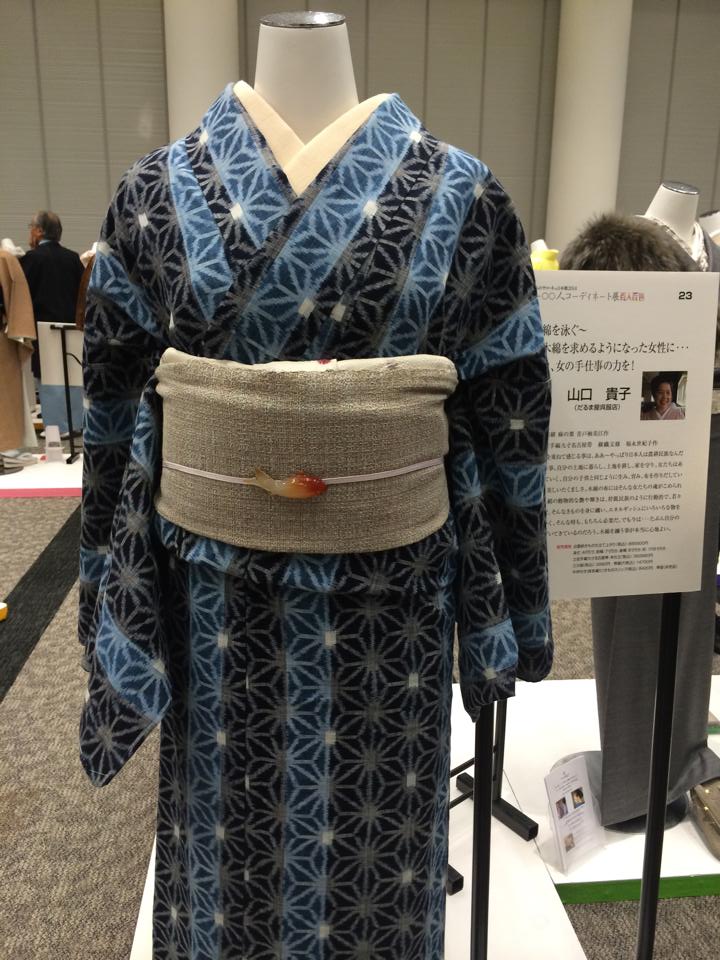 打って変わりますが、こんな木綿紬にも心惹かれます!青戸柚美江さん作の麻の葉文様木綿紬。コーディネイトは「だるま屋呉服店」の山口貴子さん。帯留使いも素敵ですね↓