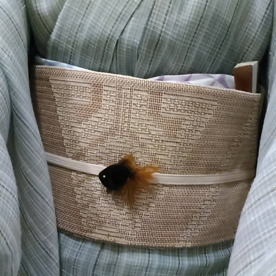 浴衣の方も多いパーティーなので、カジュアルな生成り色の羅の帯に、金魚の帯留。先日、鎌倉っ子の友人の帯探しの手伝いに鎌倉に遊びに行った時に見つけたもので、鼈甲ではなく、お高いものでもないのですが、とてもデザインが可愛いので購入しました。「し・ほ・ん」というブランドのものです。他にもセンスの良いデザインがたくさんあり、このブランドには注目していきたい☆