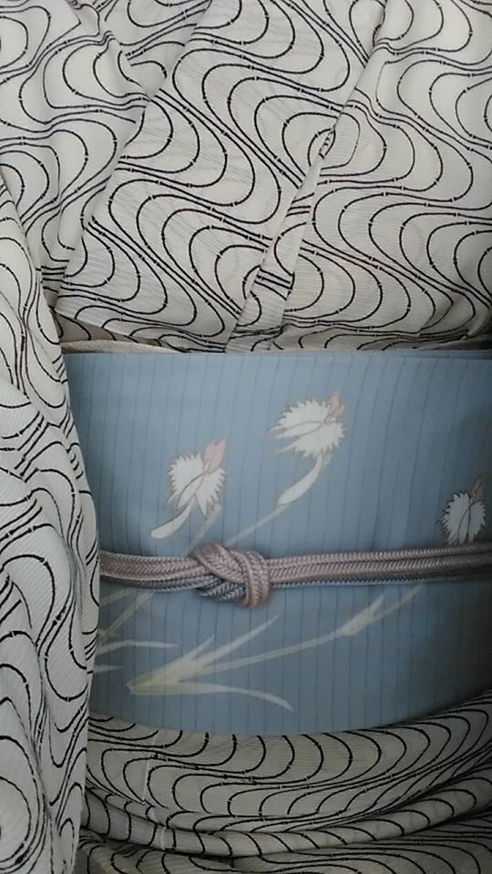 着物は、7月終わりに着たのと同じ観世水の小紋ですが、秋の予感を先取りして、桔梗の帯を締めてみました。帯締めは、上述の富座さんに頂いたもの。帯は、ゴールデンウィークに出かけた骨董市で、書道用具を探していたはずなのについつい買ってしまった紗の袋帯‥なのですが、前に柄を出すと何故だか長さが足らず、やむなくむりやり垂れの下に折り込んで、名古屋に結んでいます。偽名古屋帯…?ふふふ…