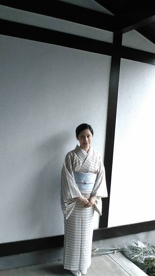 一緒に写っているのは、この着物を縫って下さった和裁士の須藤泉さん。私は衿の形にこだわりがあり、その希望を取り入れつつ、また、上半身の薄い私の体形に合わせ、工夫して寸法を取って下さっています。紬のきものはどうしても布が身体から離れがちになることが悩みの種ですが、仕立てによっては裃のようになりかねない紗紬が、よくなじんでいるのが分かって頂けると思います。さすが泉さん!