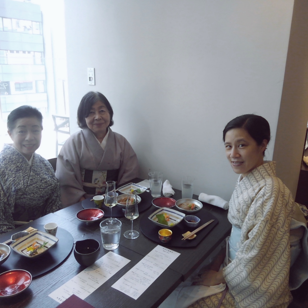 まず初めは、毎日7月の終わり。まだ毎日30度超えの日が続いていた或る日、服飾史家であり、帯締めの名門「道明」会長夫人でもある、敬愛する道明三保子先生と、「美しいキモノ」元副編集長で染織記者の第一人者であられる富澤輝実子さんという染織の大先輩お二人とランチ会をした日のコーディネートを。場所は、銀座で本格的な金沢料理を堪能できる、その名も「銀座の金沢」。何とこの日、私の初めての単著の発売を記念して、お祝いをしてくださいました。