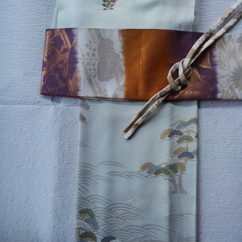 きものは、綸子地に松のある海浜風景の一つ紋訪問着。きもの仲間のお友だちが数回着たものを、お安く譲ってくれました(紋は自分の家の紋に変えています)。とてもきれいな状態で、ありがたい。こういった格の高い柄行きの訪問着を一枚持っておくと、とにかく安心ですね。
