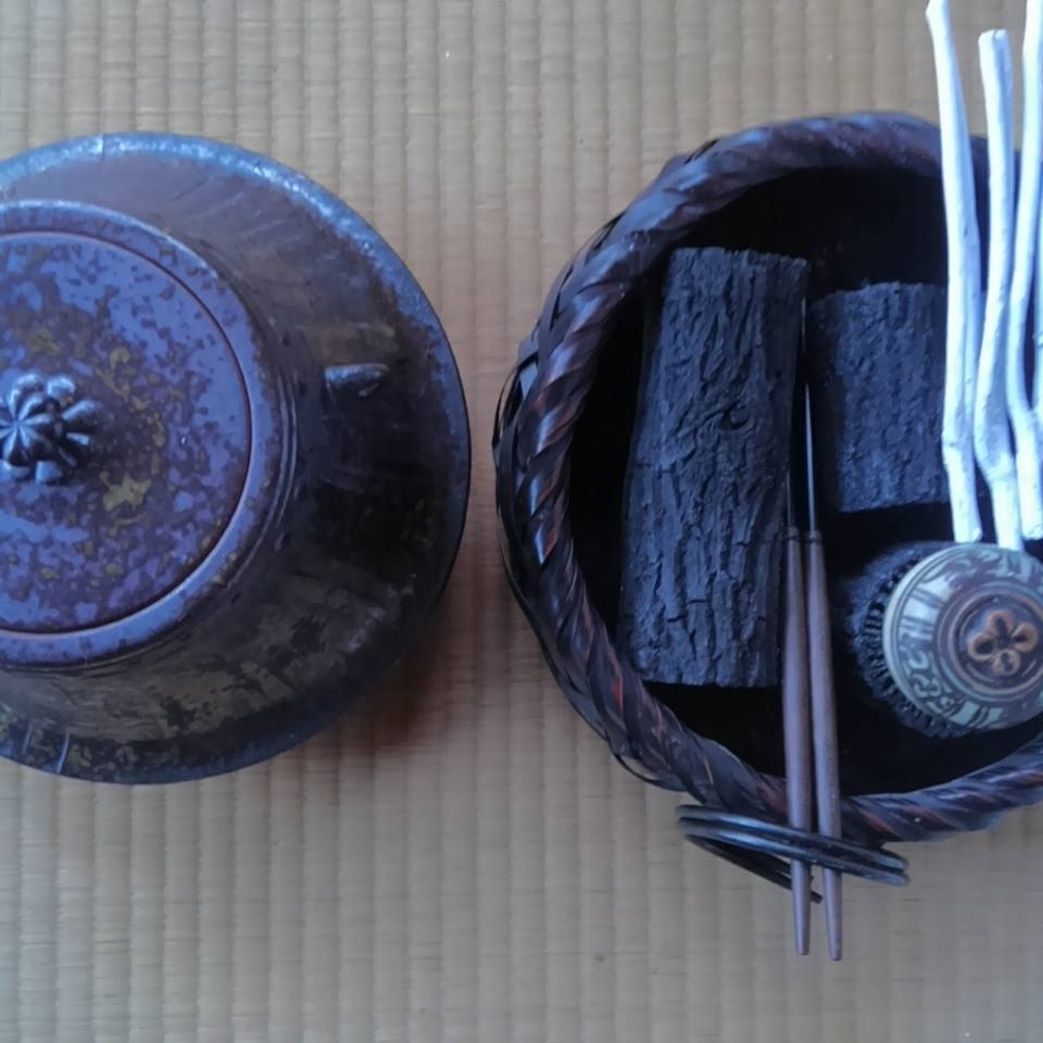 上の写真がその稽古で使っていた道具なのですが、この釜、実は陶器製です。祖父の形見の奈良・赤膚焼き松田正柏作で、陶器製の釜は結構珍しいのではないでしょうか。その横の炭斗(籠のこと)、火箸、環は、何しろ家に炉がないため持ち合わせがなく、ヤフオクでお安いものを揃えました(何しろ稽古用ですから‥)。炭は、一回分のセットを購入して。いやはや点前のお役目が割り当てられると大変です。