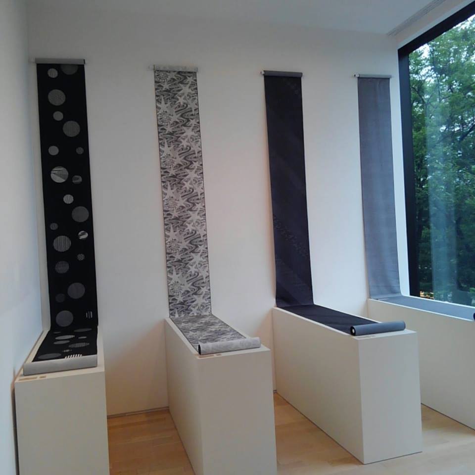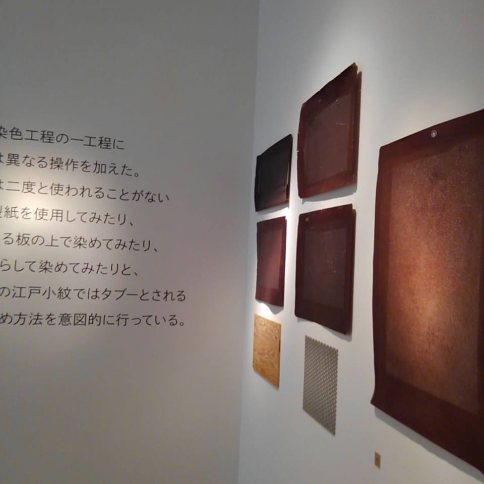 そんな廣瀬さんの工房の百周年。私の想像では、お家でお持ちの4千枚!にも及ぶ型紙を展示したり、江戸からの伝統の柄から新作柄の小紋まで、反物をずらりと並べて展示するのでは?‥と思っていたのですが‥まったく予想を裏切られ、現代アートの展覧会と言って良い、新たな視点で江戸小紋をとらえる素晴らしい内容でした。