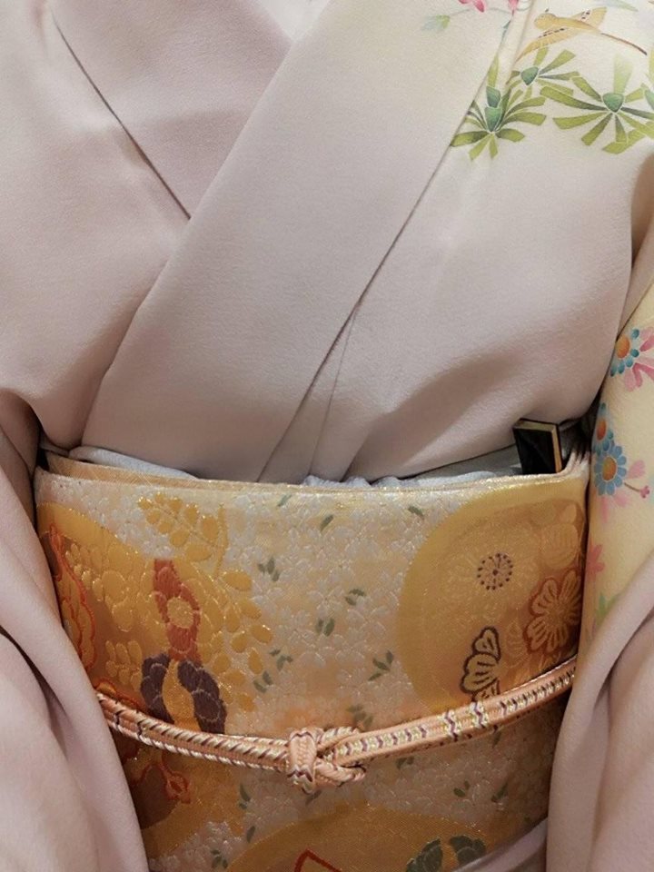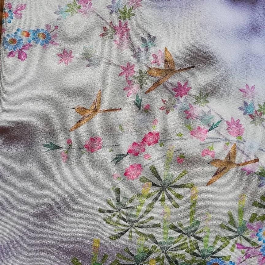奇しくも先生も私も、淡い色調の装いとなりました。私の訪問着は、初釜らしく華やかにと思い、四季の花と槙の木の間を鳥が飛ぶ、楽しい柄行きの一枚を択びました。袖の写真を撮ってみましたのでご覧ください。おきもの友だちの皆様、そう、小川呉服店の一枚です♪↓