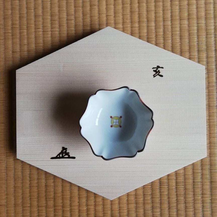向付には遠州流さんのご家紋の七宝紋が染められています。亀甲盆には「亥」の字とお家元の花押が。ご本部直属のお道具屋さんで漆を塗って頂くことも出来るとのご案内を頂きましたが、木地のままもすっきりしていて良いし‥とまだ長考中。かなりキッパリとした性格ですが、買い物は常に長考なのです。
