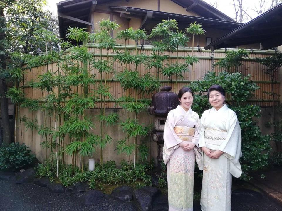 恐らく日本で一番大きな肩衝では?と思われる大型の春慶の肩衝や、仁清の素晴らしい花入など、数々のお道具を拝見して眼福の時だったのですが、もちろん席中では写真を撮れません。玄関の前はオーケーとのことでしたので、先生とぱちり。美味しいものをたくさん頂いた後で口紅が落ちていますが、お見逃しの上、下の写真をご覧ください↓